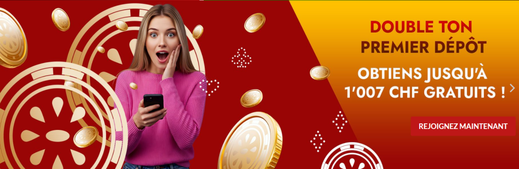 • 🎁 Bonus de bienvenue : 100% du premier dépôt jusqu’à 400 CHF (min. 20 CHF)